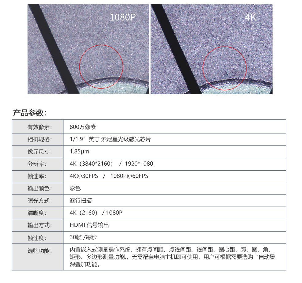 随着 4K 超超高分辨率显示器的出现, 1080P 图像已无法展示图像的精细度。我司结合 SONY高灵敏度、低噪声的 SENSOR 系列 CMOS 图像传感器、推出了4K超高清工业相机搭配*光学系统,为您提供实时全方位0度视角的1超高清的显微放大观察。