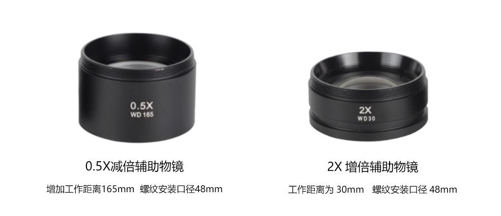 体视显微镜辅助物镜是对体视显微镜的功能扩展,根据用户需要进行整个显微镜的工作距离增加,直接旋到体视显微镜观察头下端螺纹口上即可使用,在辅助物镜下端备环型灯卡槽可接环型灯。